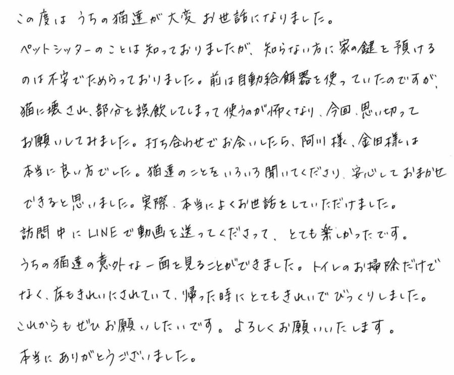 ペットシッターのことは知っておりましたが、知らない方に家の鍵を預けるのは不安でためらっておりました。