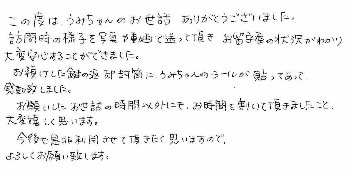 訪問時の様子を写真や動画で送って頂き、お留守番の状況がわかり大変安心することができました。