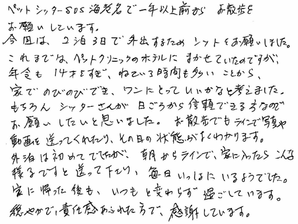 ペットシッターSOS海老名店で一年以上前からお散歩をお願いしています。