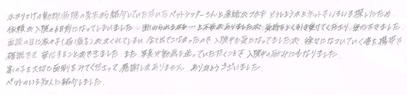 かかりつけの動物病院の先生から紹介していただいたペットシッターさんと連絡がつかず、どうしようかとネットでいろいろ探したため依頼が入院の6日前になってしまいました。