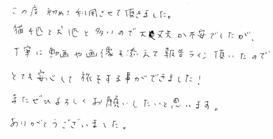 猫4匹と犬1匹と多いので大丈夫か不安でしたが、丁寧に動画や画像を添えて報告ライン頂いたので、とても安心して旅をする事ができました!