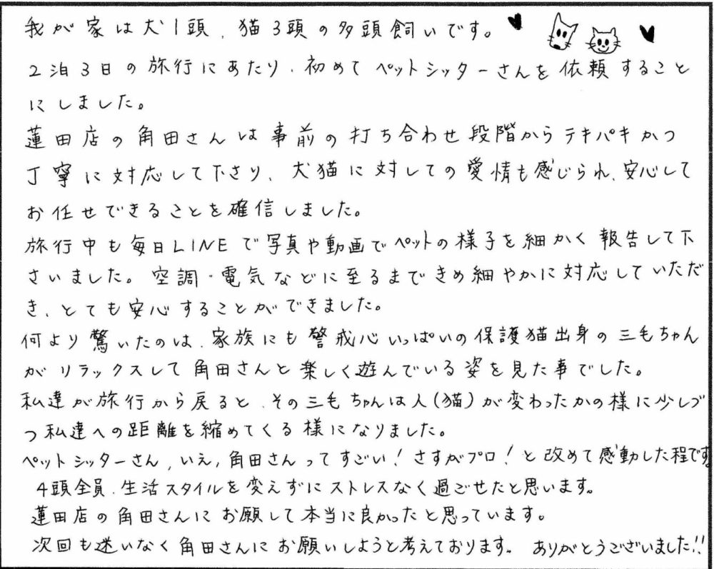 旅行中も毎日LINEで写真や動画でペットの様子を細かく報告して下さいました。空調・電気などに至るまできめ細やかに対応していただき、とても安心することができました。