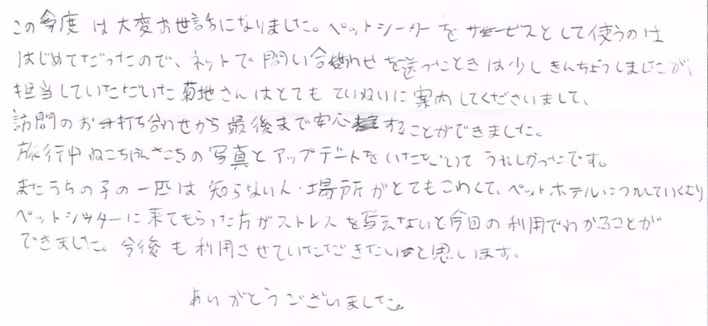 ペットシッターをサービスとして使うのははじめてだったので、ネットで問い合わせを送ったときは少しきんちょうしましたが、担当していただいた菊地さんはとてもていねいに案内してくださいまして、訪問のお打ち合わせから最後まで安心することができました。