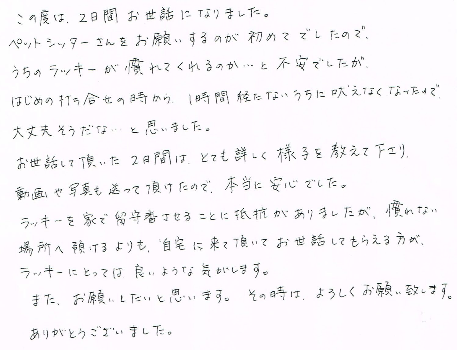 ペットシッターさんをお願いするのが初めてでしたので、うちのラッキーが慣れてくれるのか…と不安でしたが、はじめの打ち合せの時から、1時間経たないうちに吠えなくなったので、大丈夫そうだな…と思いました。