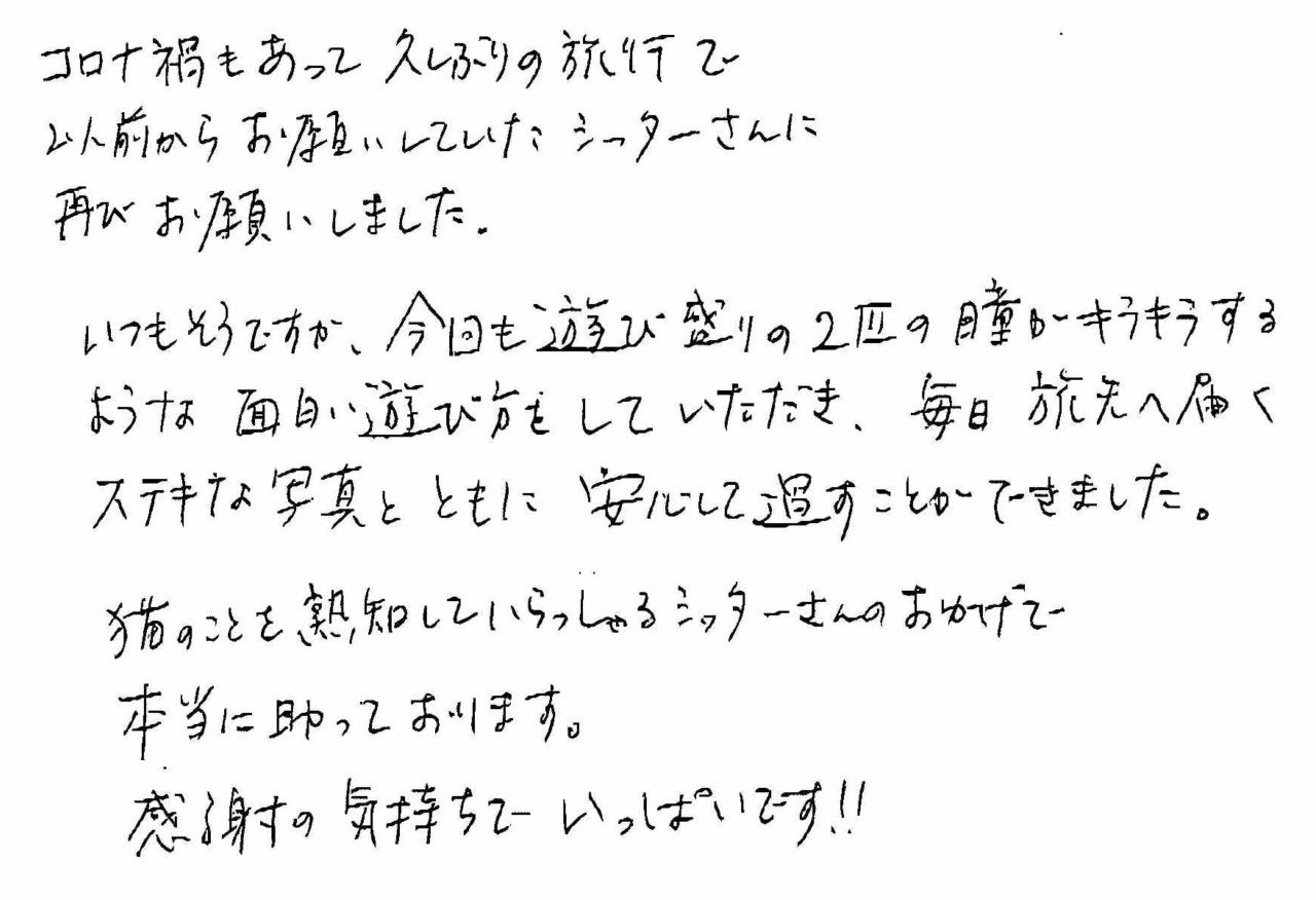 いつもそうですが、今回も遊び盛りの2匹の瞳がキラキラするような面白い遊び方をしていただき、毎日旅先へ届くステキな写真とともに安心して過すことができました。