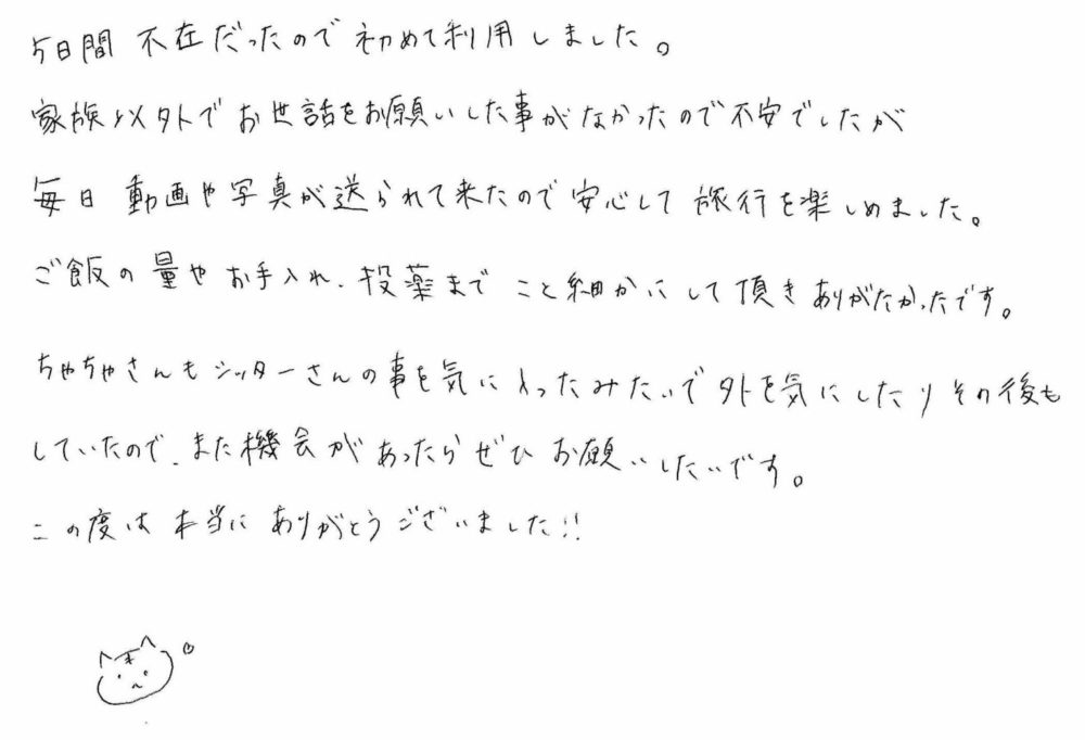 ちゃちゃさんもシッターさんの事を気に入ったみたいで外を気にしたりその後もしていたので、また機会があったらぜひお願いしたいです。