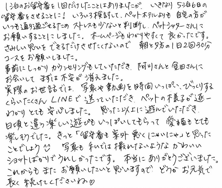 実際のお世話では、写真や動画を時間いっぱい、びっくりするくらいたくさんLINEで送っていただき、ペットの様子が逐一わかりとても安心しました。