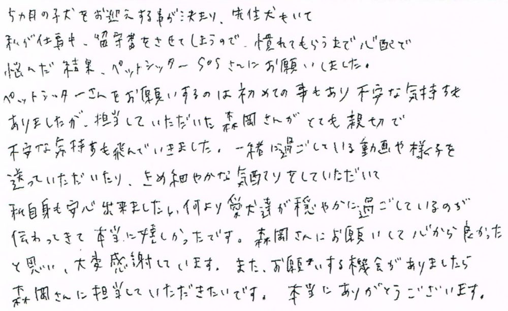 ペットシッターさんをお願いするのは初めての事もあり不安な気持ちもありましたが、担当していただいた森岡さんがとても親切で不安な気持ちも飛んでいきました。