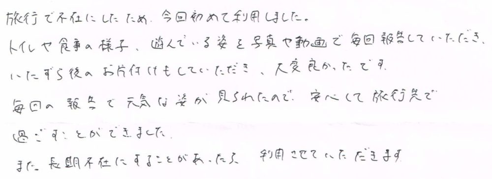 毎回の報告で元気な姿が見られたので、安心して旅行先で過ごすことができました。