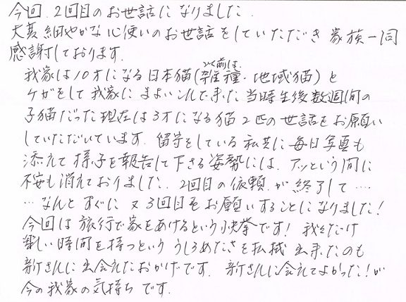 我家は10才になる日本猫(以前は雑種・地域猫)とケガをして我家にまよいこんで来た当時生後数週間の子猫だった現在は3才になる猫の2匹の世話をお願いしていただいています。