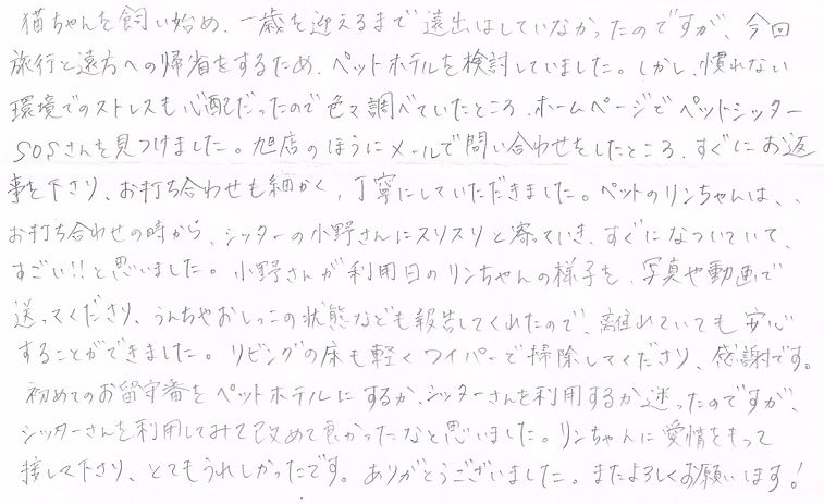しかし、慣れない環境でのストレスも心配だったので色々調べていたところ、ホームページでペットシッターSOSさんを見つけました。