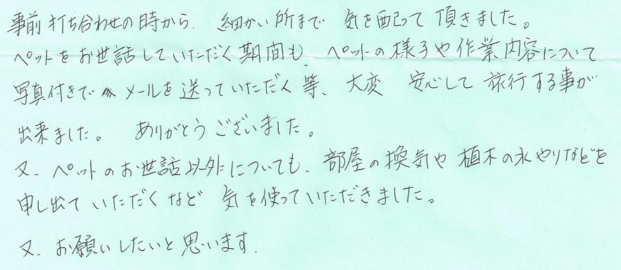 又、ペットのお世話以外についても、部屋の換気や植木の水やりなどを申し出ていただくなど気を使っていただきました。