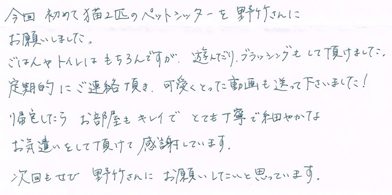 今回初めて猫2匹のペットシッターを野竹さんにお願いしました。