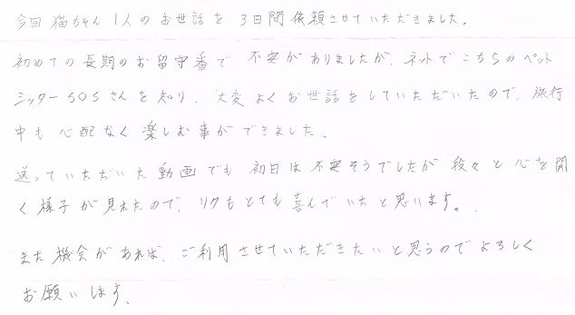 初めて長期のお留守番で不安がありましたが、ネットでこちらのペットシッターSOSさんを知り、大変よくお世話していただいたので、旅行中も心配なく楽しむ事ができました。