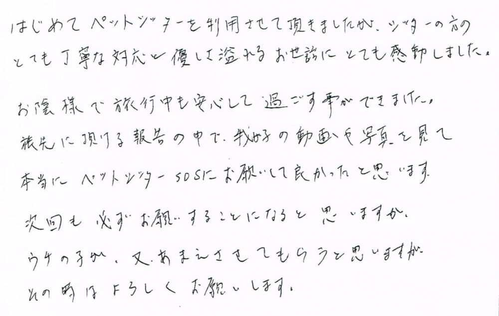 はじめてペットシッターを利用させて頂きましたが、シッターの方のとても丁寧な対応と優しさ溢れるお世話にとても感動しました。