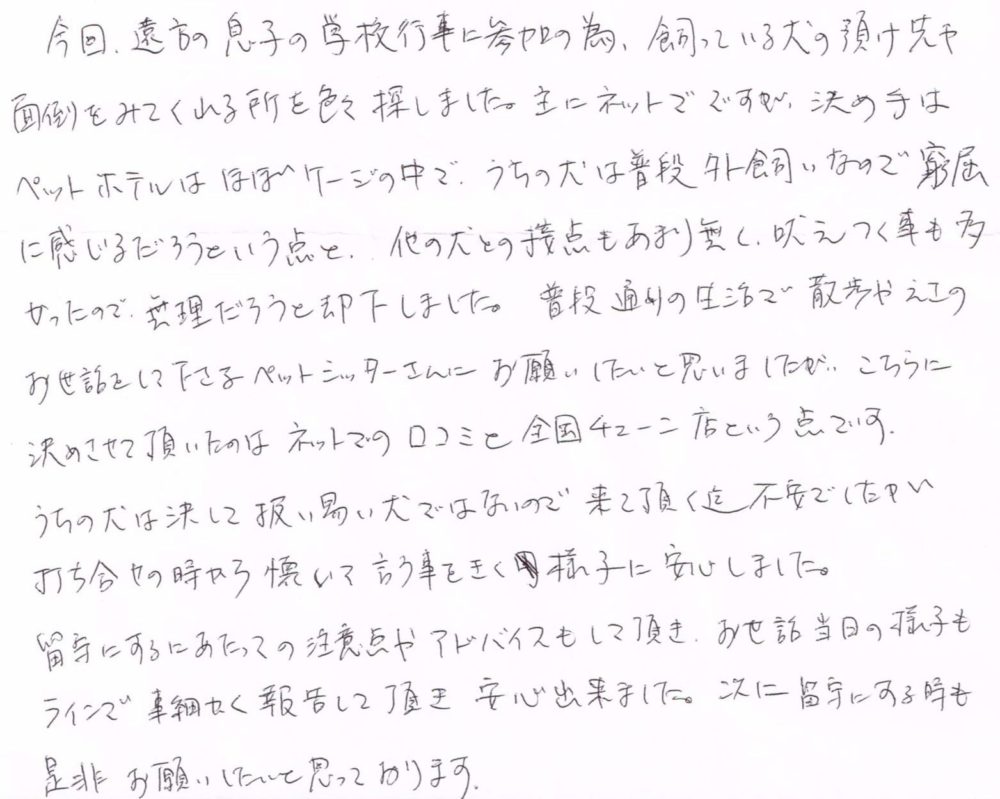 普段通りの生活で散歩やえさのお世話をして下さるペットシッターさんにお願いしたいと思いましたが、こちらに決めさせて頂いたのはネットでの口コミと全国チェーン店という点です。