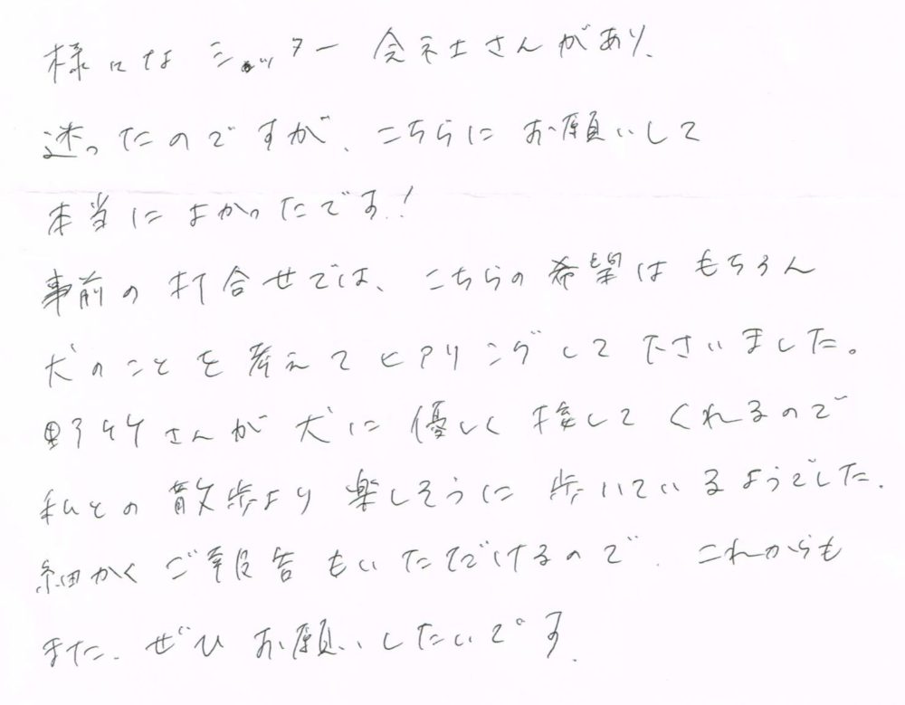 事前の打合せでは、こちらの希望はもちろん犬のことを考えてヒアリングして下さいました。