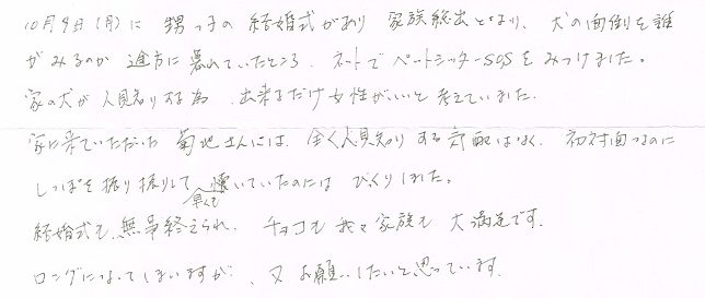 10月9日(月)に甥っ子の結婚式があり家族総出となり、犬の面倒を誰がみるのか途方に暮れていたところ、ネットでペットシッターSOSをみつけました。