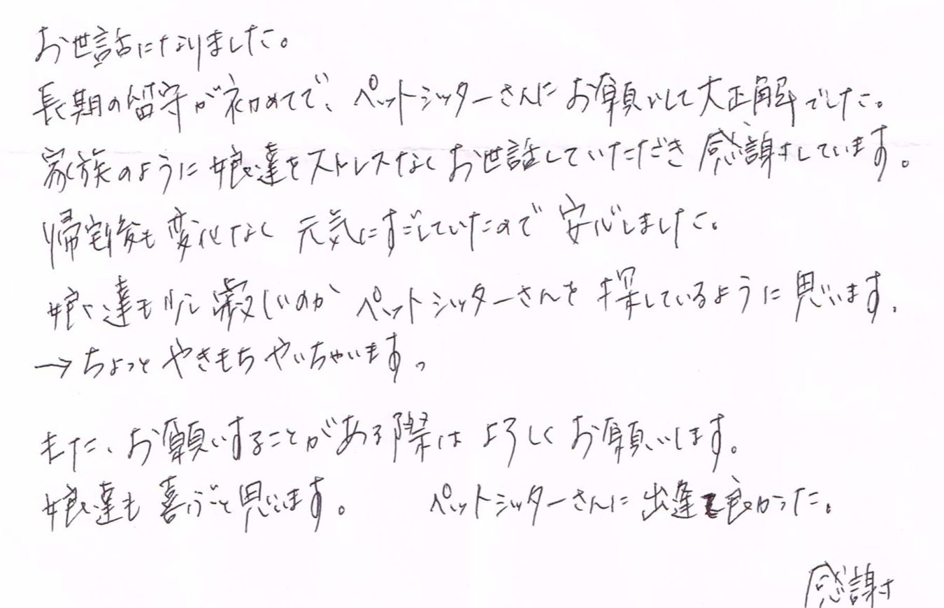 家族のように娘達をストレスなくお世話していただき感謝しています。