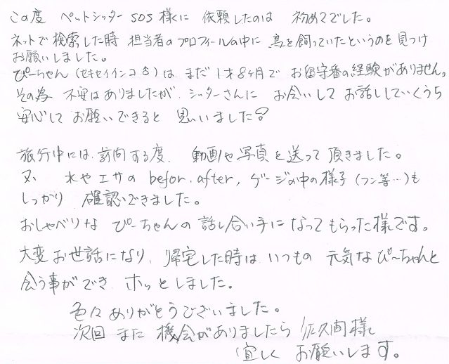 大変お世話になり、帰宅した時はいつもの元気なぴーちゃんと会う事ができ、ホッとしました。