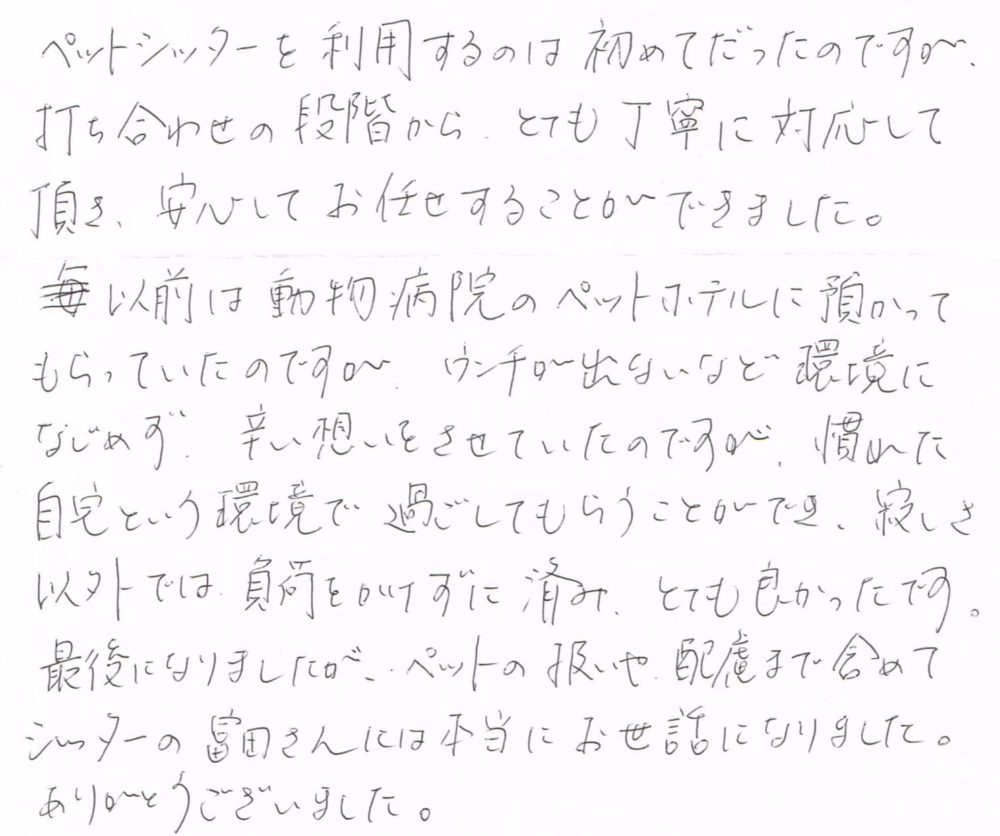 以前は動物病院のペットホテルに預かってもらっていたのですが、ウンチが出ないなど環境になじめず、辛い想いをさせていたのですが、慣れた自宅という環境で過ごしてもらうことができ、寂しさ以外では負担をかけずに済み、とても良かったです。