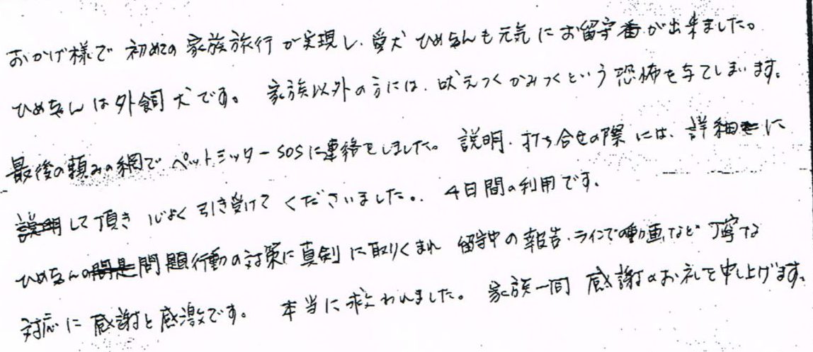 ひめちゃんの問題行動の対策に真剣に取りくまれ留守中の報告・ラインでの動画など丁寧な対応に感謝と感激です。