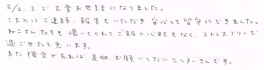 ねこさんたちも懐いてくれてご飯の心配もなく、ストレスフリーで過ごせたと思います。