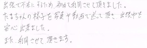 たまちゃんの様子を写真や動画で送って頂き、出張中も安心できました。