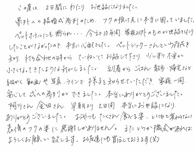県外への結婚式参列のため、フクの預け先に本当に困っていました。