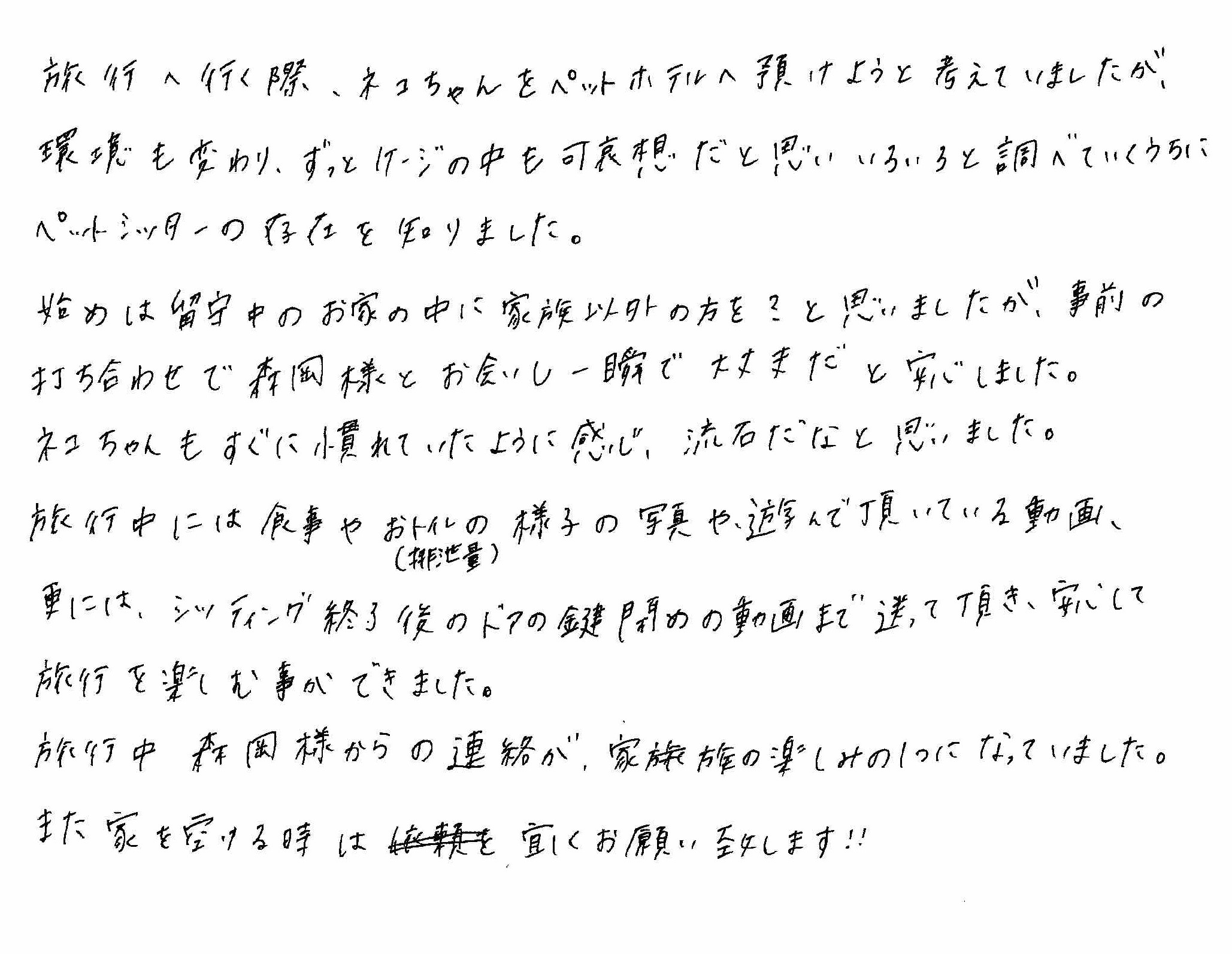 旅行中には食事やおトイレ(排泄量)の様子の写真や、遊んで頂いている動画、更には、シッティング終了後のドアの鍵閉めの動画まで送って頂き、安心して旅行を楽しむ事ができました。