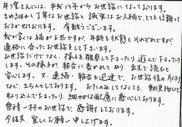 きめ細かく丁寧なお世話と誠実なお人柄で、とても信頼しておまかせしております。有難うございます。