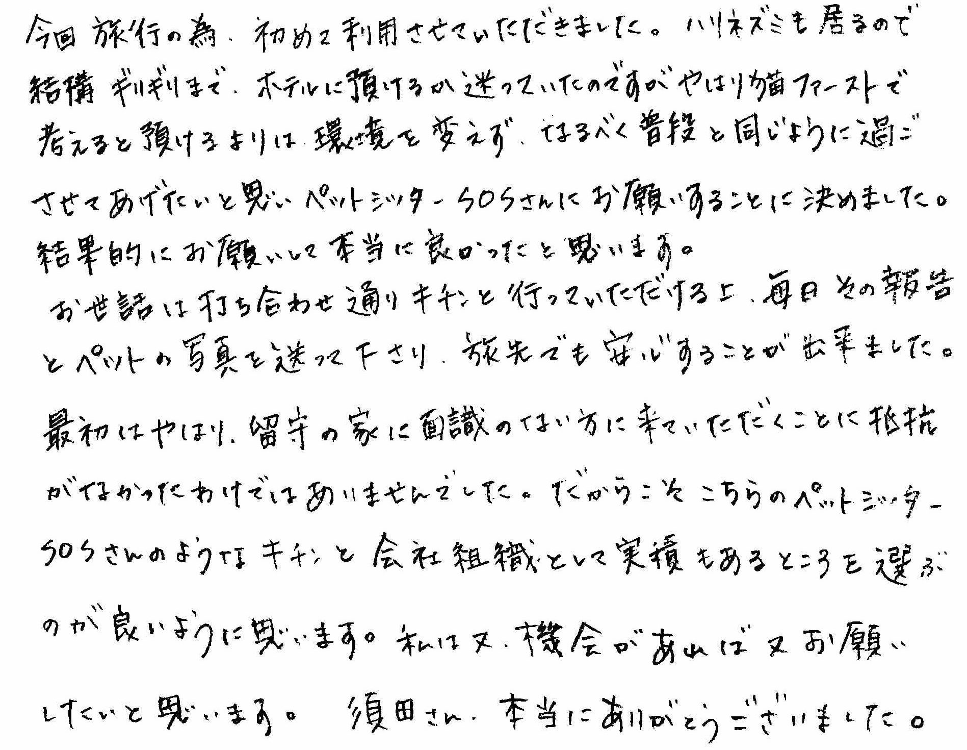 お世話は打ち合わせ通りキチンと行っていただける上、毎日その報告とペットの写真を送って下さり、旅先でも安心することが出来ました。