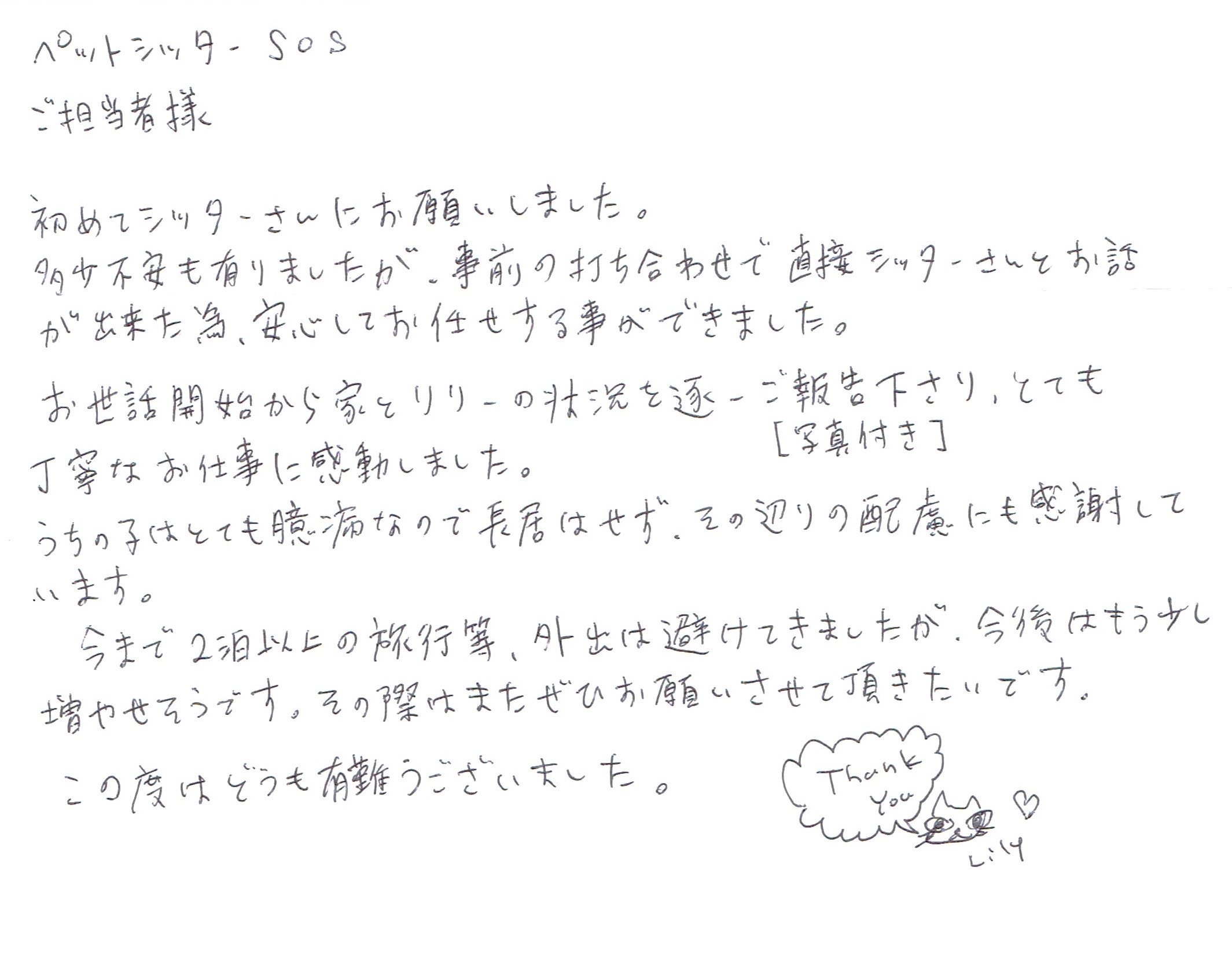 お世話開始から家とリリーの状況を逐一ご報告下さり [写真付き] 、とても丁寧なお仕事に感動しました。