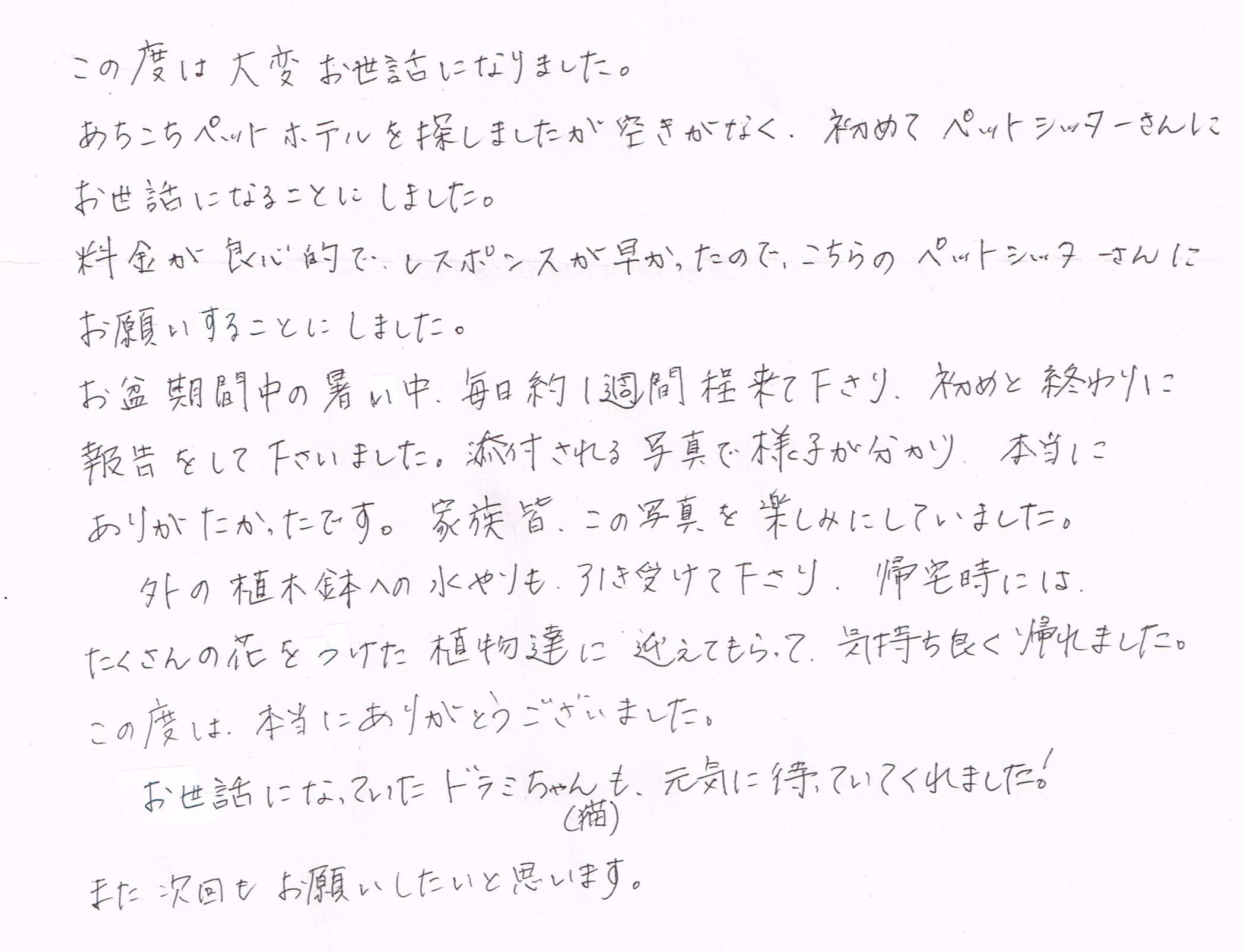 お盆期間中の暑い中、毎日約1週間程来て下さり、初めと終わりに報告をして下さいました。