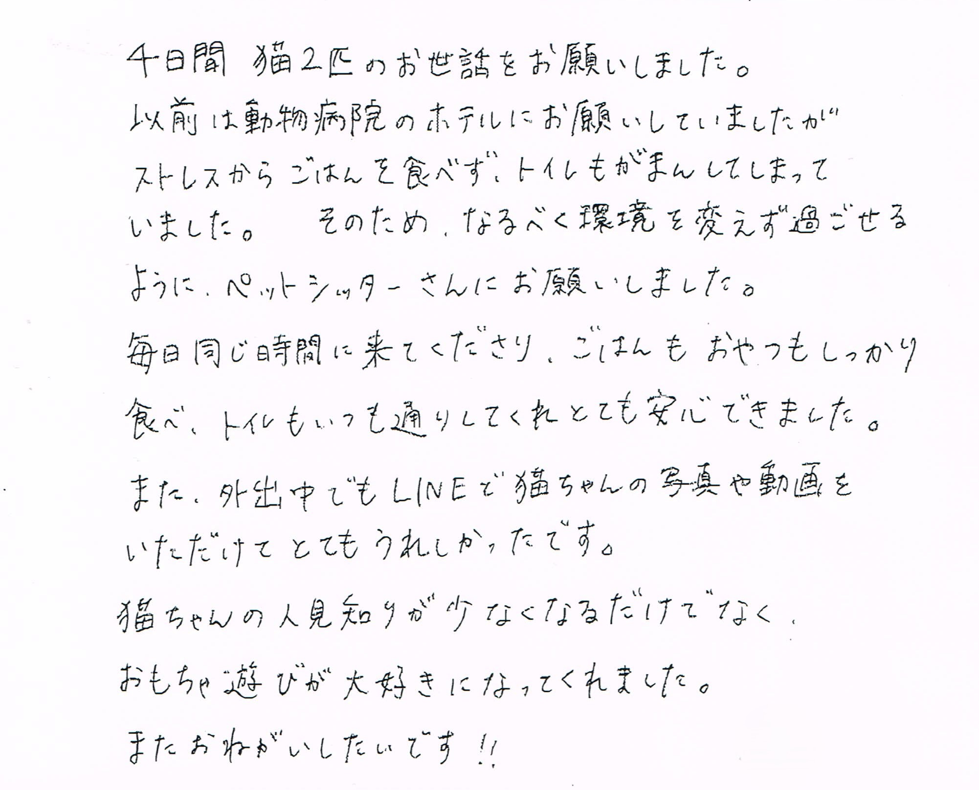 また、外出中でもLINEで猫ちゃんの写真や動画をいただけて、とてもうれしかったです。