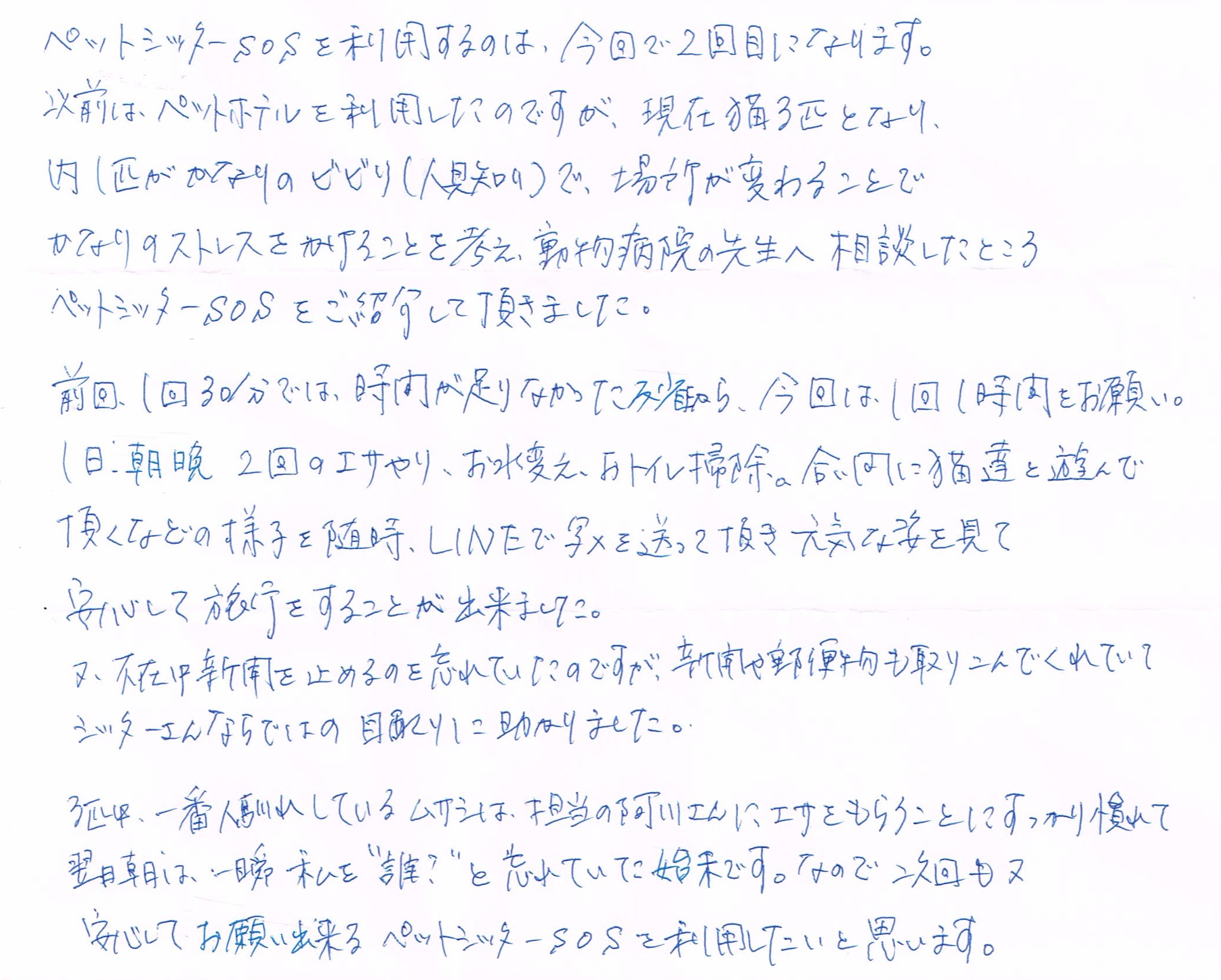 なので次回も又、安心してお願い出来るペットシッターSOSを利用したいと思います。