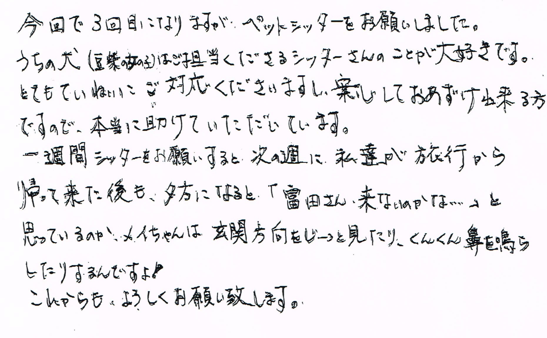 今回で3回目になりますが、ペットシッターをお願いしました。