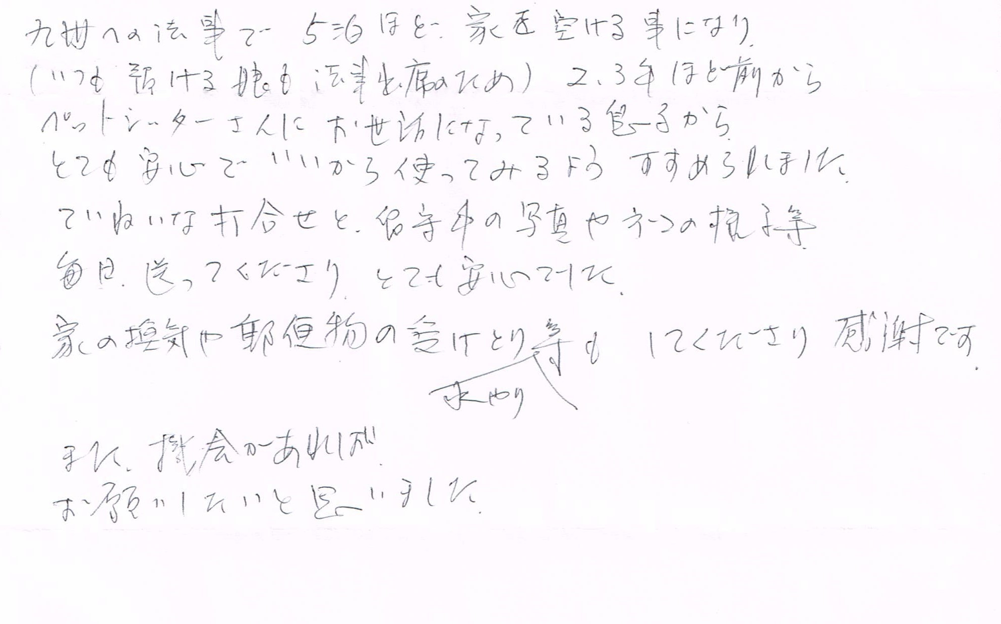 ていねいな打合せと、留守中の写真やネコの様子等、毎日送ってくださり、とても安心でした。