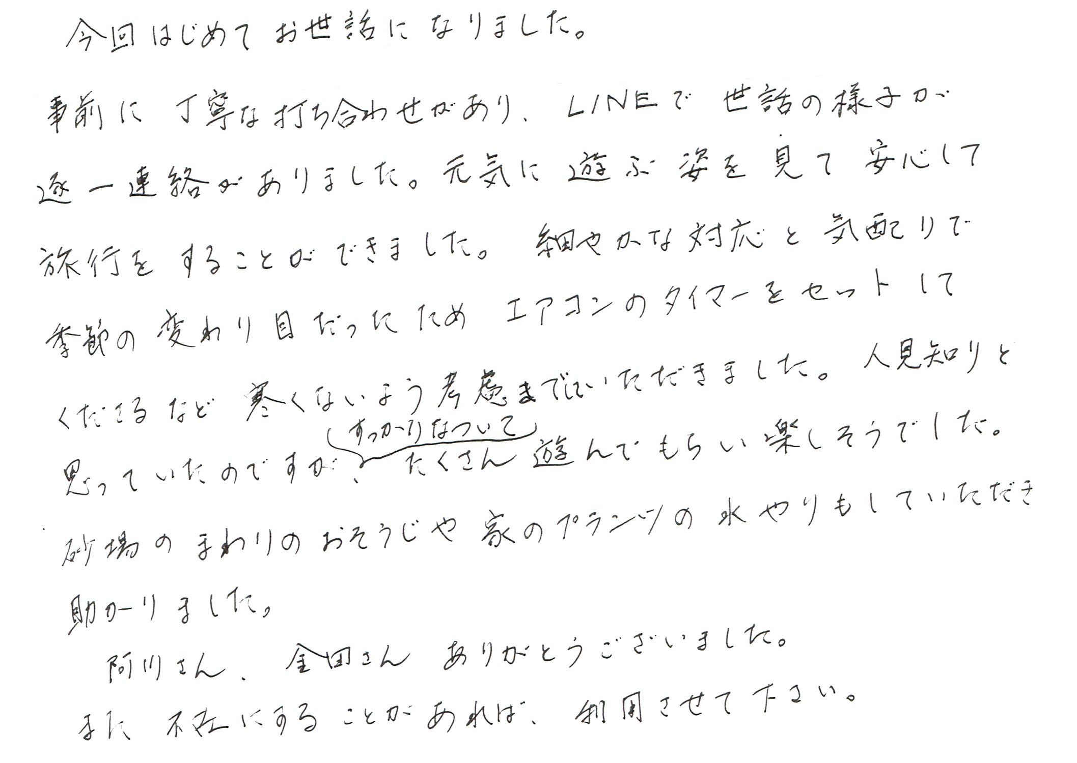 事前に丁寧な打ち合わせがあり、LINEで世話の様子が 逐一連絡がありました。
