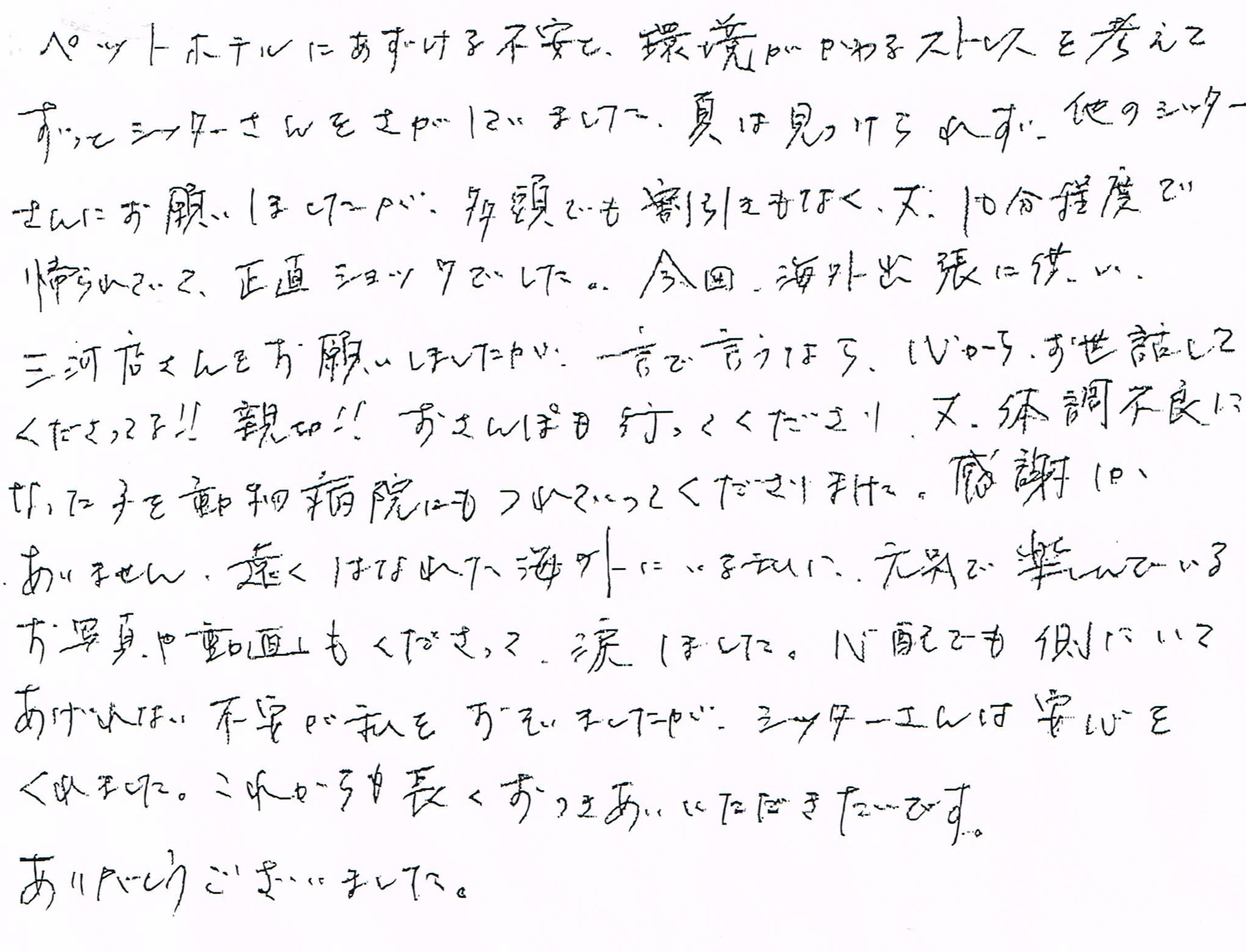 ペットホテルにあずける不安と、環境がかわるストレスを考えて、ずっとシッターさんをさがしていました。