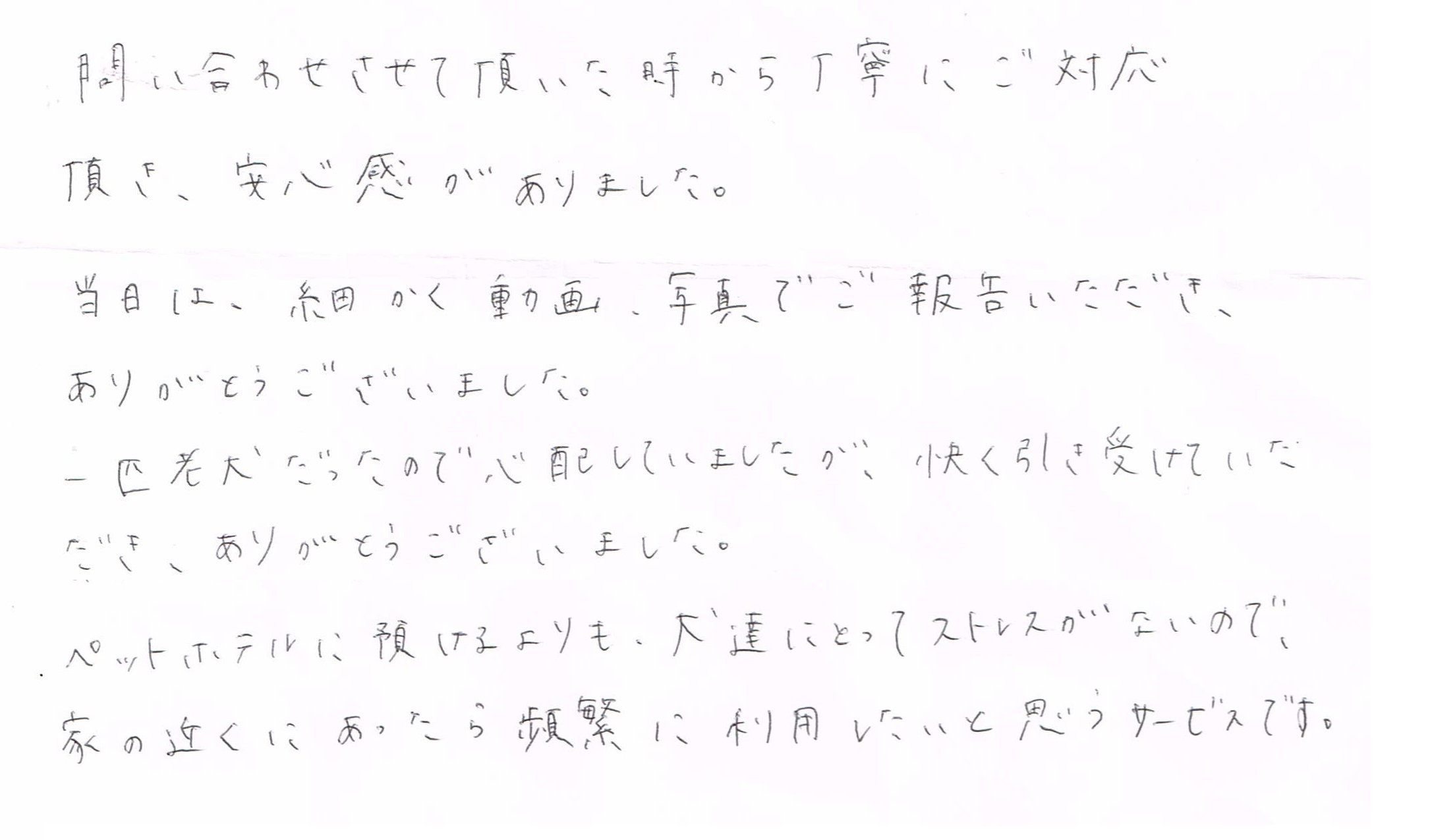 一匹老犬だったので心配していましたが、快く引き受けていただき、ありがとうございました。