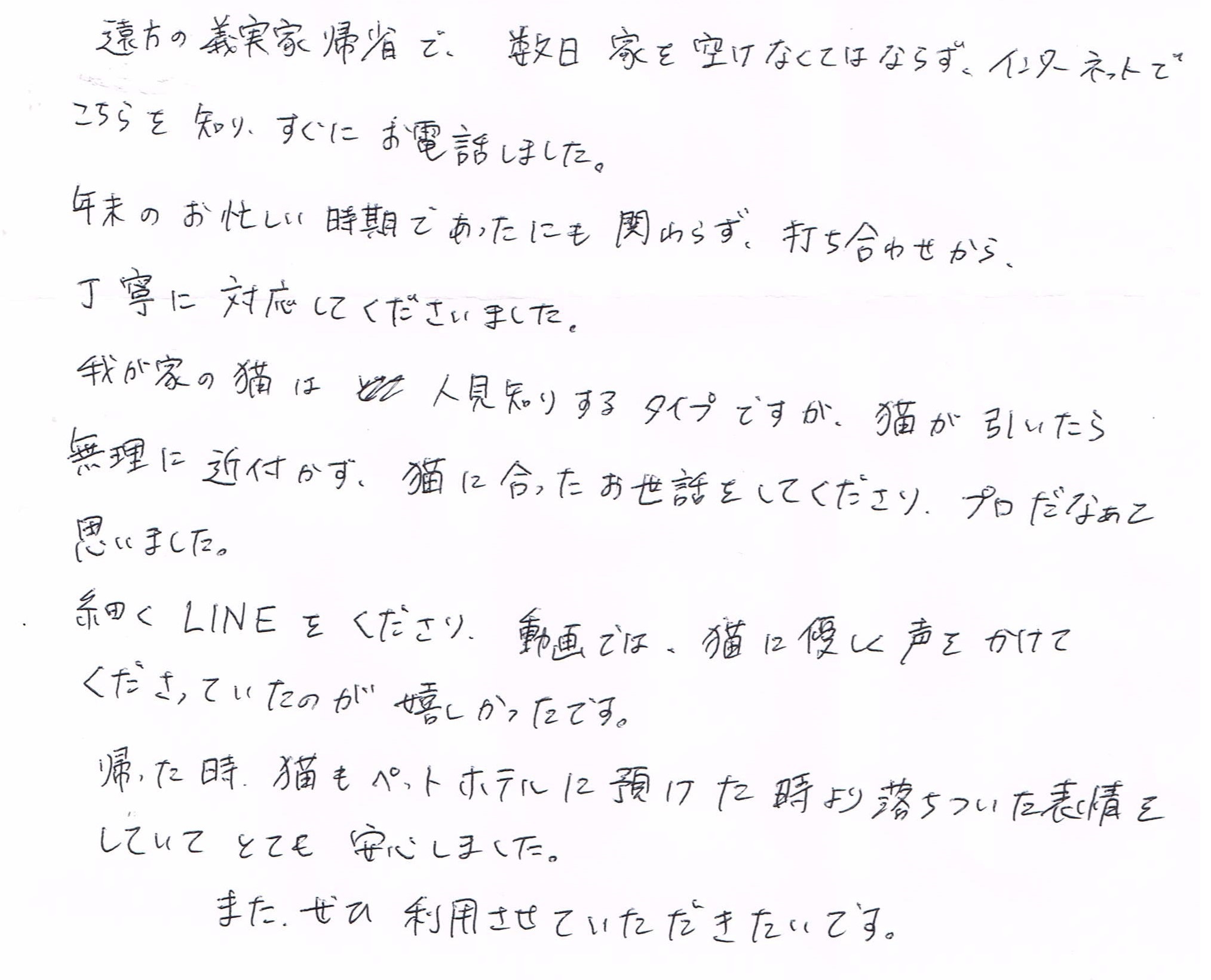 遠方の義実家帰省で、数日家を空けなくてはならず、インターネットでこちらを知り、すぐにお電話しました。