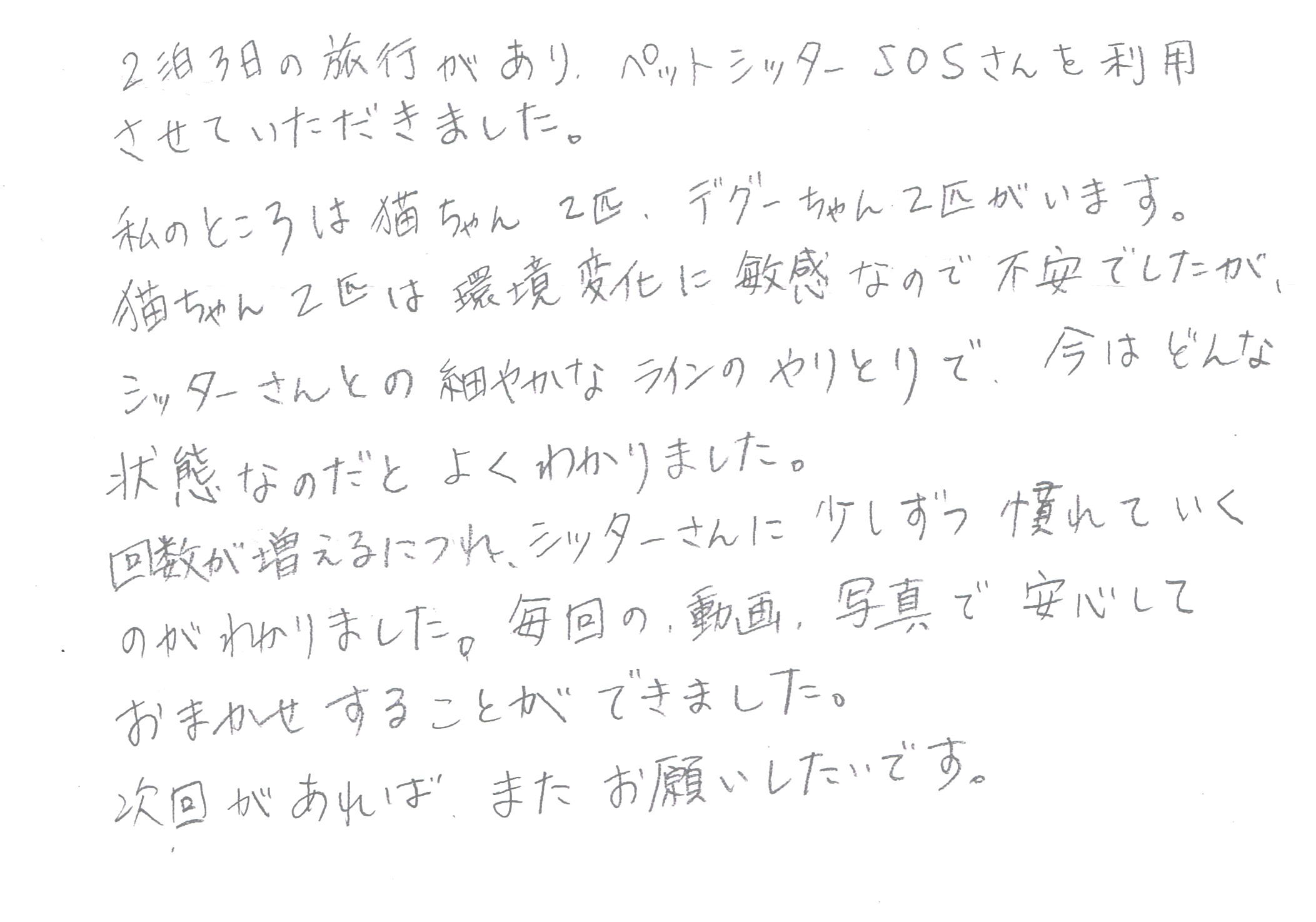 2泊3日の旅行があり、ペットシッターSOSさんを利用させていただきました。