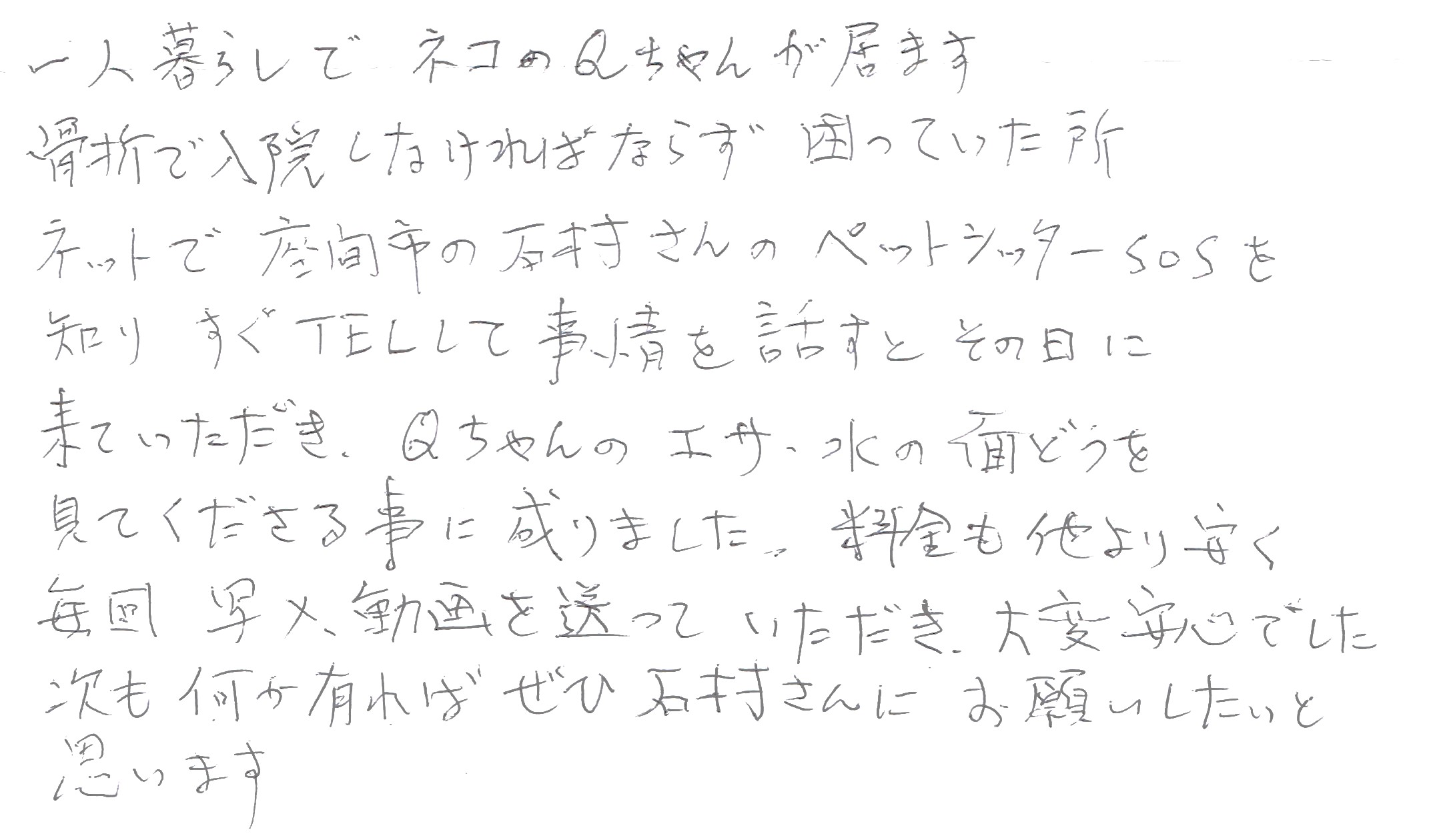 骨折で入院しなければならず困っていた所、ネットで座間市の石村さんのペットシッターSOSを知り、すぐTELして事情を話すとその日に来ていただき、Qちゃんのエサ・水の面どうを見てくださる事に成りました。