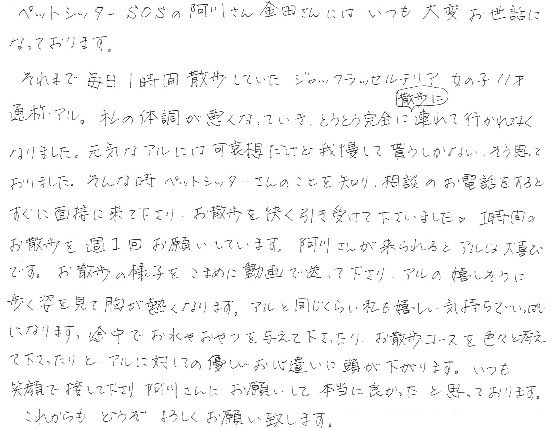 そんな時ペットシッターさんのことを知り、相談のお電話をするとすぐに面接に来て下さり、お散歩を快く引き受けて下さいました。