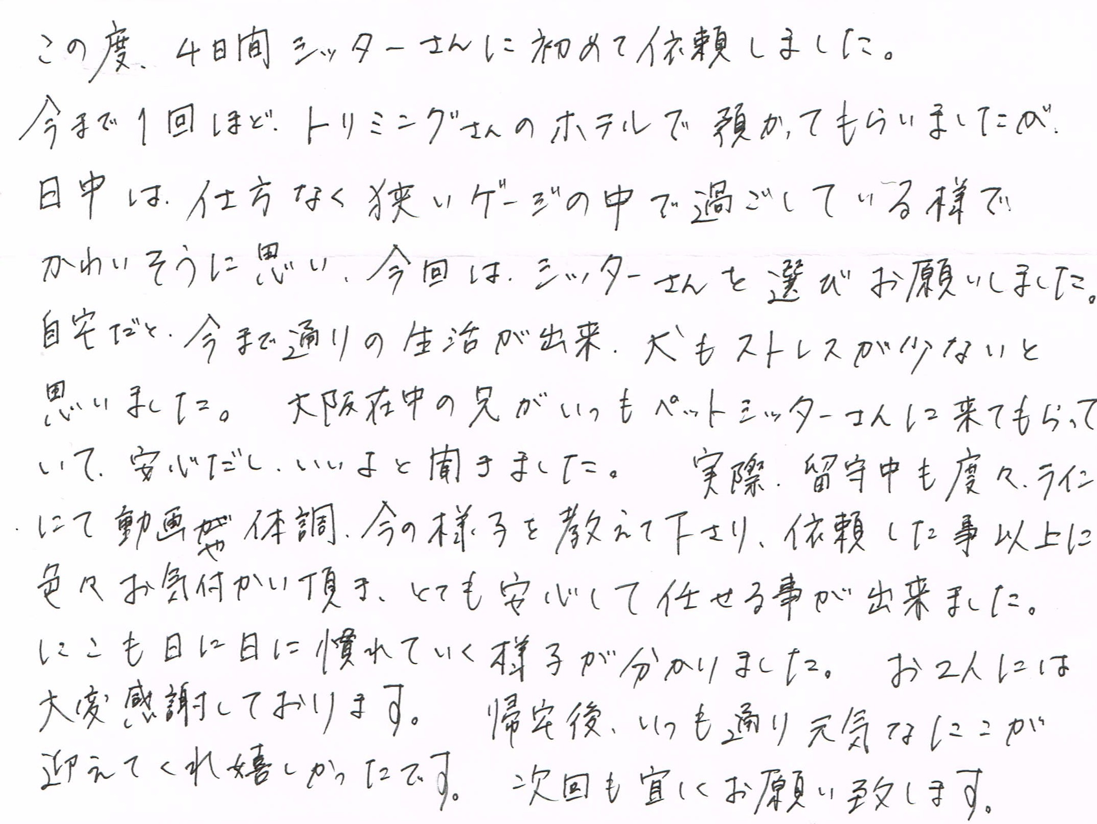 実際、留守中も度々、ラインにて動画や体調、今の様子を教えて下さり、依頼した事以上に色々お気付かい頂き、とても安心して任せる事が出来ました。