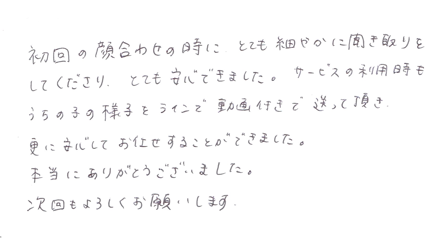 サービスの利用時も、うちの子の様子をラインで動画付きで送って頂き、更に安心してお任せすることができました。