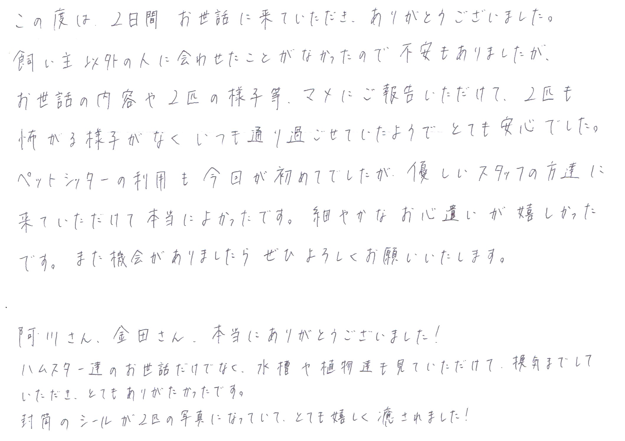 ハムスター達のお世話だけでなく、水槽や植物達も見ていただけて、換気までしていただき、とてもありがたかったです。