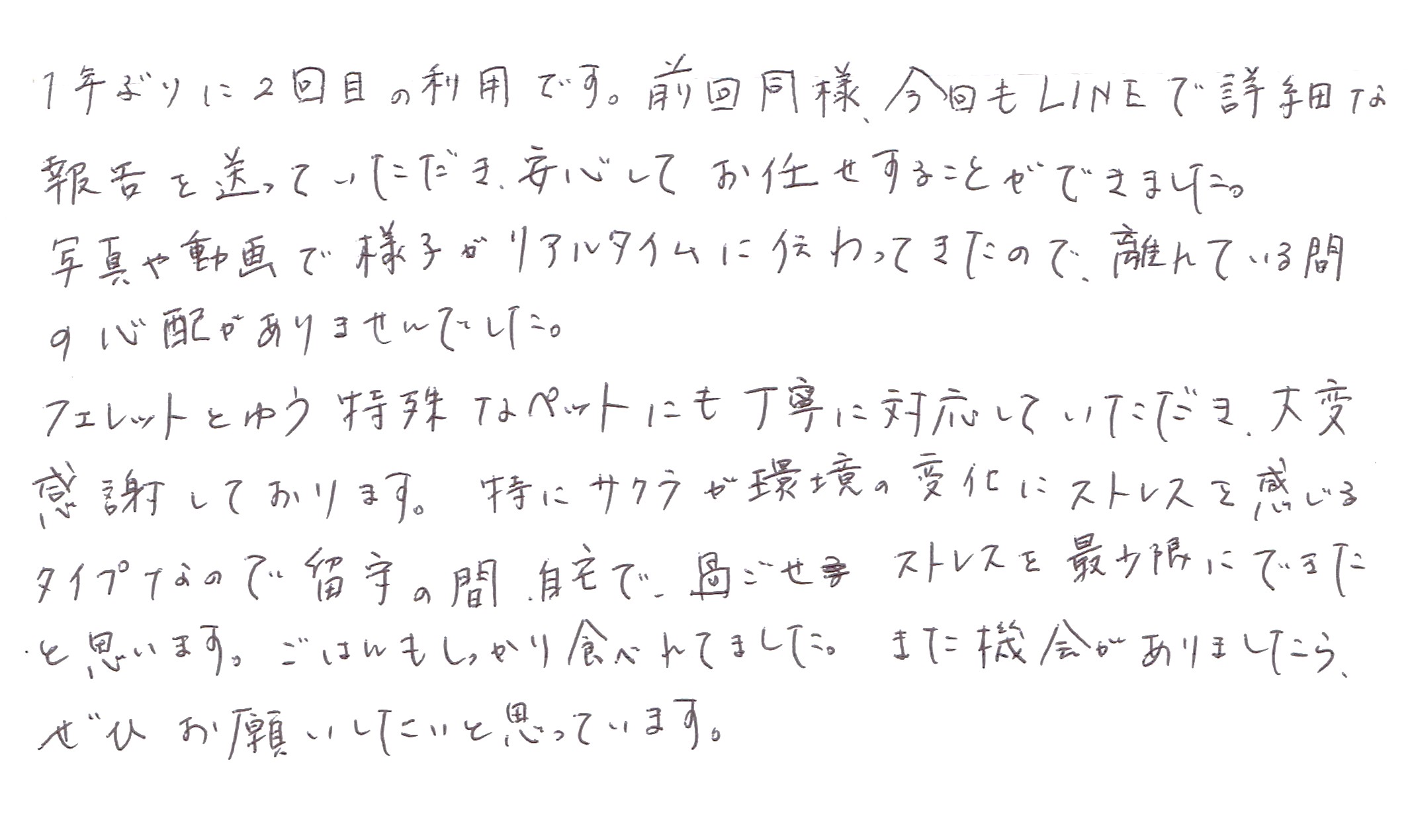 特にサクラが環境の変化にストレスを感じるタイプなので留守の間、自宅で過ごせストレスを最少限にできたと思います。ごはんもしっかり食べれてました。