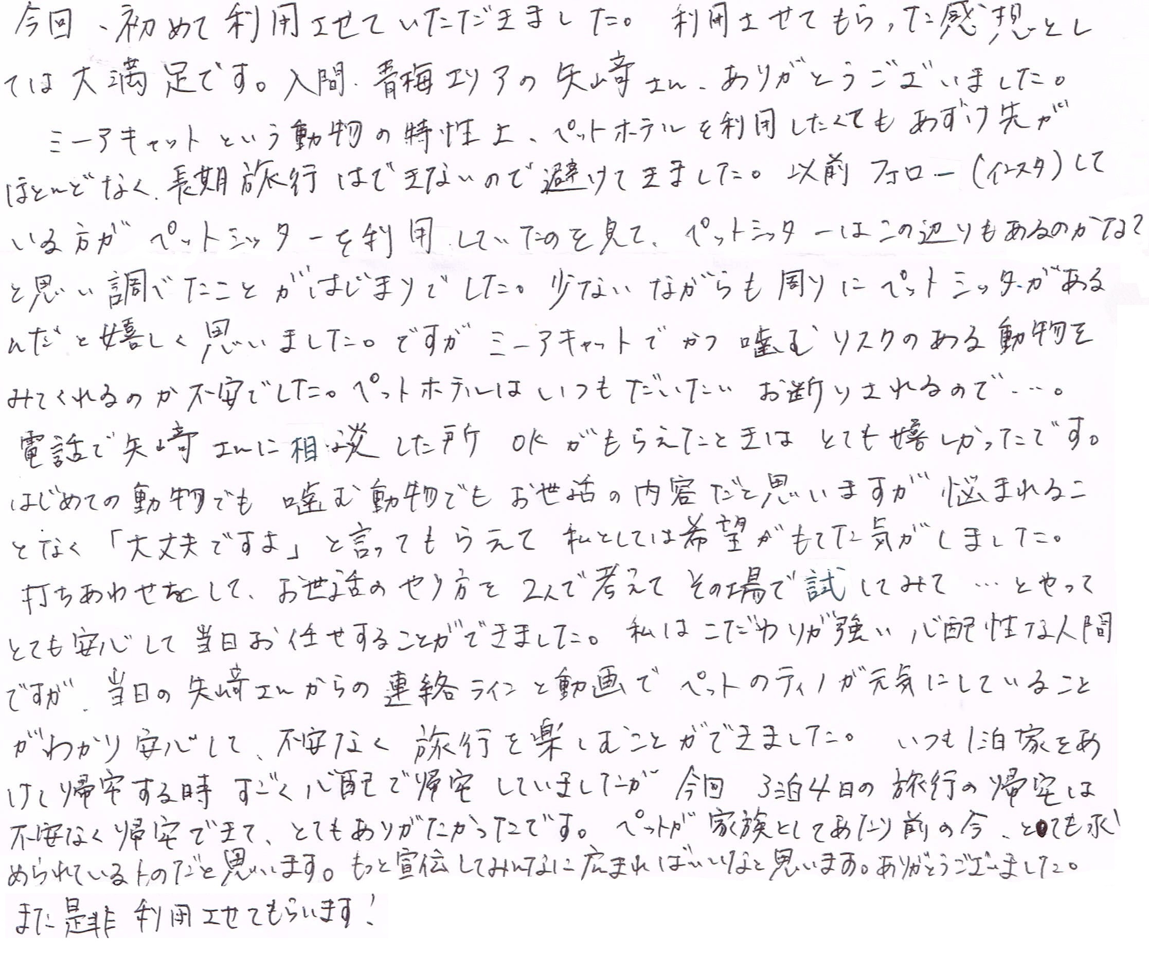 ミーアキャットという動物の特性上、ペットホテルを利用したくてもあずけ先がほとんどなく、長期旅行はできないので避けてきました。以前フォロー(インスタ)している方がペットシッターを利用していたのを見て、ペットシッターはこの辺りもあるのかな?と思い調べたことがはじまりでした。少ないながらも周りにペットシッターがあるんだと嬉しく思いました。